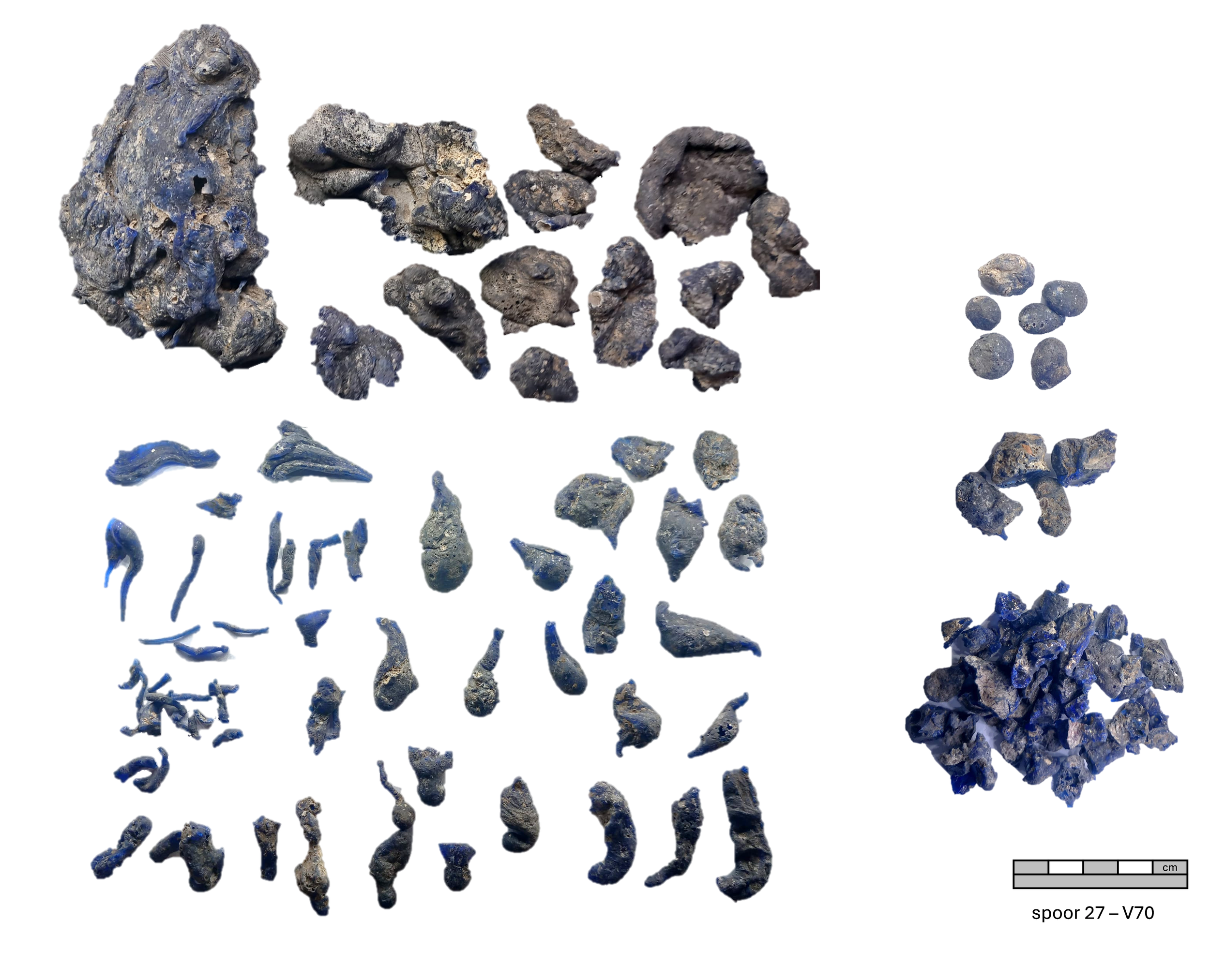 Figuur 14: Overzicht van blauwe glasfragmenten uit graf S27 (Composiet T. Clerbaut).